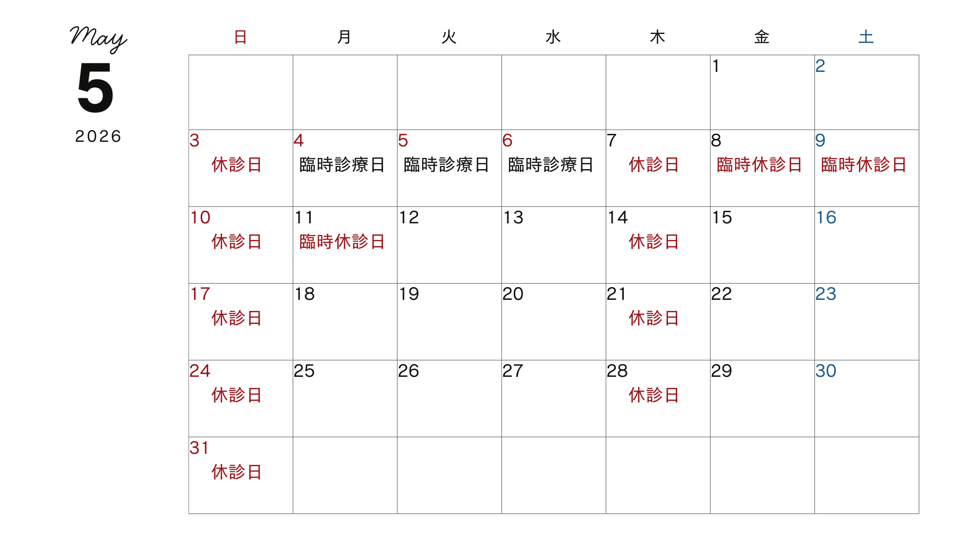 5月7日(木曜日)から11日(月曜日)まで休診とさせていただきます。