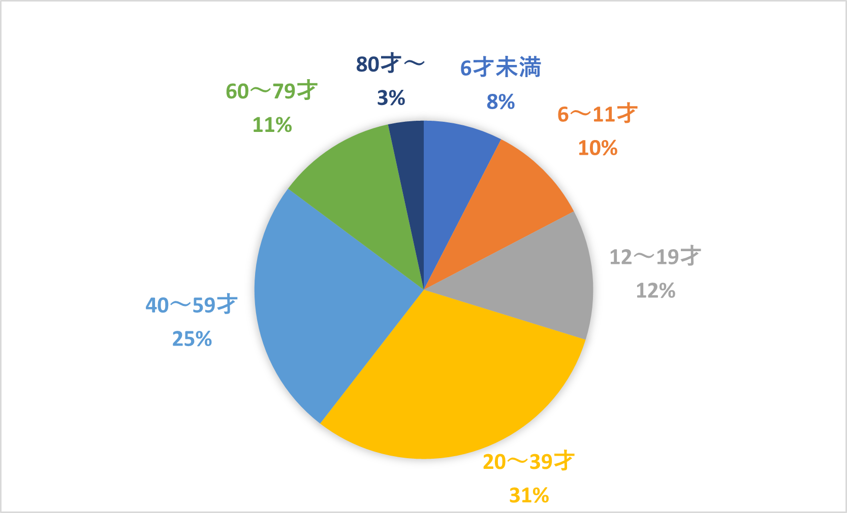下のグラフは当院での年代別受診割合を表しています。どの年代の患者様にも幅広く受診していただいています。